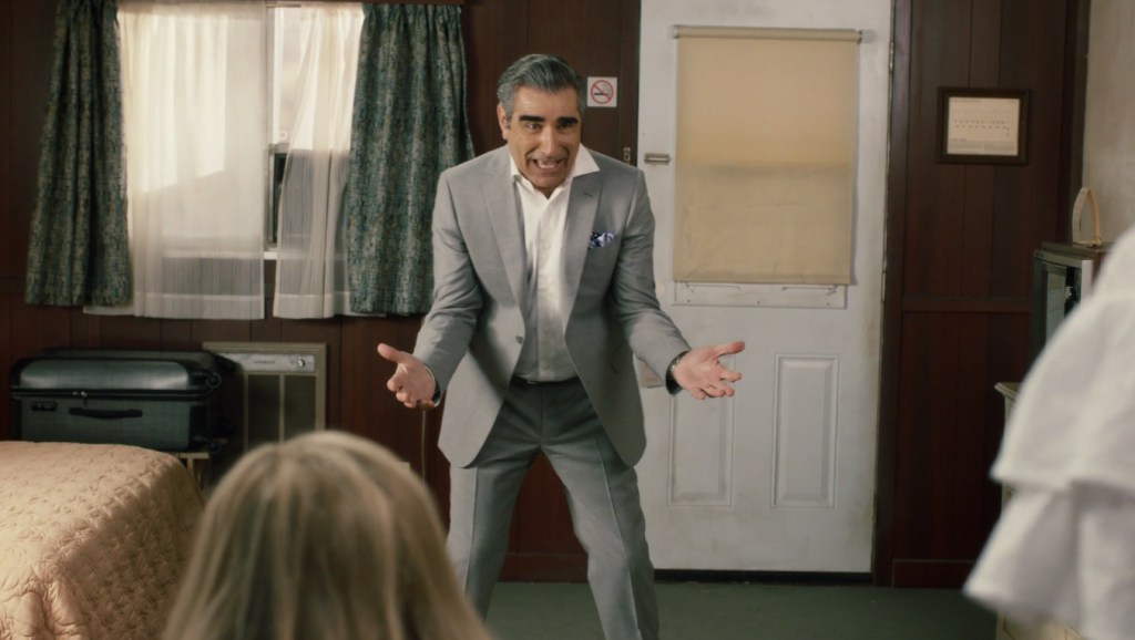 The last two episodes of Season 1 of Schitt’s Creek are funny, awkward, predictable and have a few heart warming and heart breaking scenes. From some affectionate rump grabbing to cringe worthy goodbyes, we laughed and covered our eyes through these episodes and found that the relationship between Johnny and Moira continues to be the most fulfilling aspect of the show. David’s personal struggles with the town of Schitt’s Creek, and the possibility of leaving, are what we are most looking forward to seeing play out in Season 2, and what becomes of his friendship (and more!) with Stevie. Alexis did nothing to endear herself during these final episodes, in fact she managed to make herself less likeable in the end.